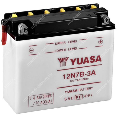 Свинцово-кислотный аккумулятор YUASA 12N7B-3A (ёмкость 7 Ач, напряжение 12 В, пусковой ток 70 А) разработан специально для мототехники. Его главные отличительные особенности — высокие разрядные характеристики при малых размерах, виброустойчивость и стабильная работа при экстремальных температурах. Корпус выполнен из долговечного пластика. Аккумуляторы YUASA — премиальный сегмент, это подтверждено и сертификатами и доверием во всём мире, в том числе от крупнейших производителей мототехники.